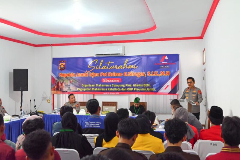 JURNALISHUKUM.COM, JAMBI – Kapolda Jambi Irjen Pol. Krisno H. Siregar, melaksanakan kegiatan Silaturahmi bersama Organisasi Mahasiswa Cipayung Plus, Aliansi BEM, Paguyuban Mahasiswa Kabupaten/Kota, dan OKP Provinsi Jambi di Rumah Kebangsaan Siginjai, Kamis (16/10/2025).