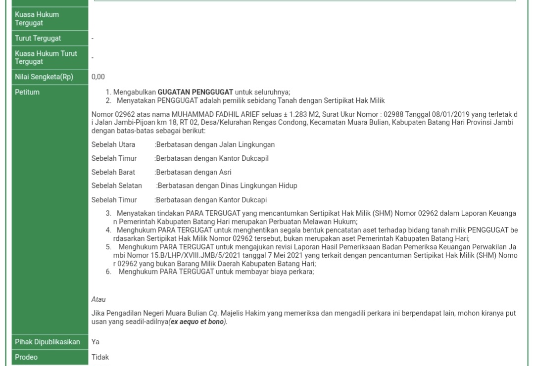 Hingga berita ini diturunkan, tim redaksi masih menanti respons resmi dari Pemerintah Daerah Kabupaten Batang Hari terkait gugatan dan dalil yang disampaikan penggugat.