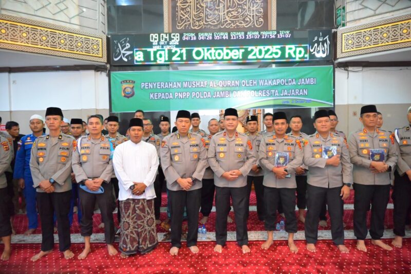 JURNALISHUKUM.COM, JAMBI – Wakapolda Jambi Brigjen Pol. M. Mustaqim menyerahkan Mushaf Al-Qur’an kepada PNPP (Pegawai Negeri pada Polri) Polda Jambi serta perwakilan Polres/Ta jajaran, Kamis (23/10/2025).